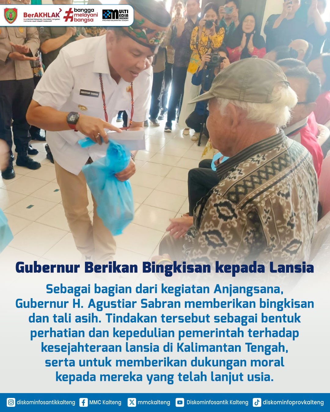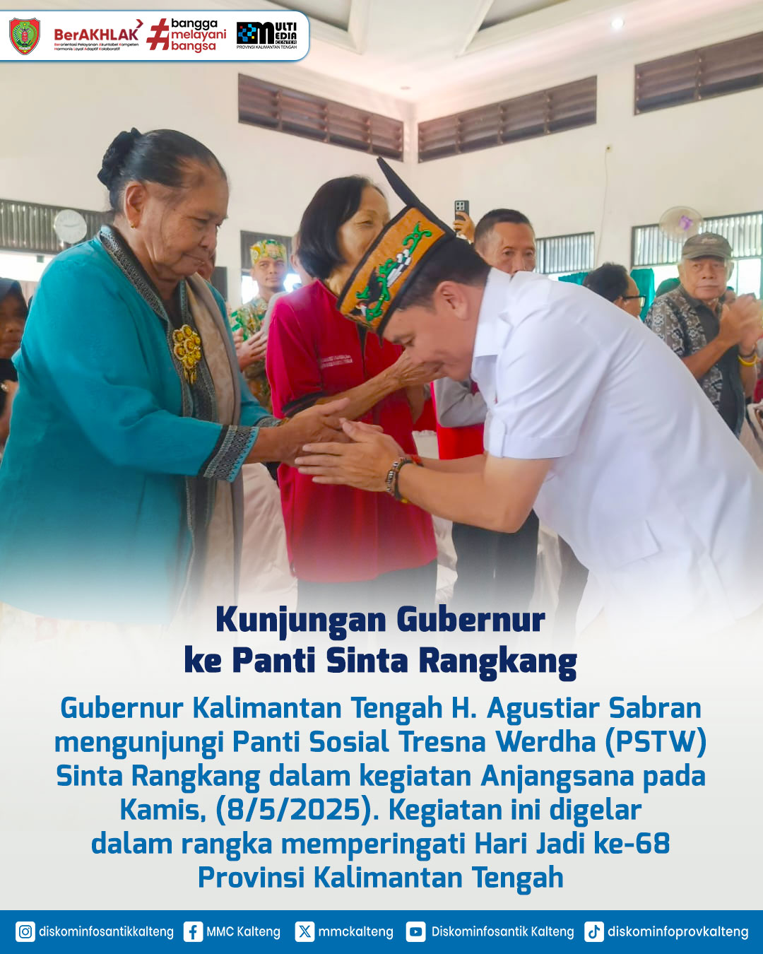 Dalam rangka memperingati Hari Jadi ke-68 Provinsi Kalimantan Tengah, Gubernur H. Agustiar Sabran mengunjungi Panti Sosial Tresna Werdha (PSTW) Sinta Rangkang Palangka Raya pada Kamis, (8/5/2025). Gubernur H. Agustiar Sabran menegaskan pentingnya peran negara dan masyarakat dalam memberikan perlindungan dan dukungan kepada para lansia sebagai bagian dari menjaga peradaban dan kesejahteraan Kalimantan Tengah.