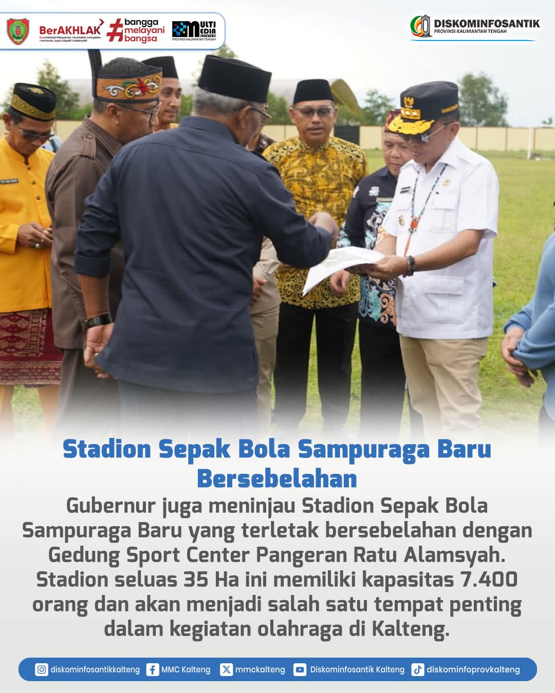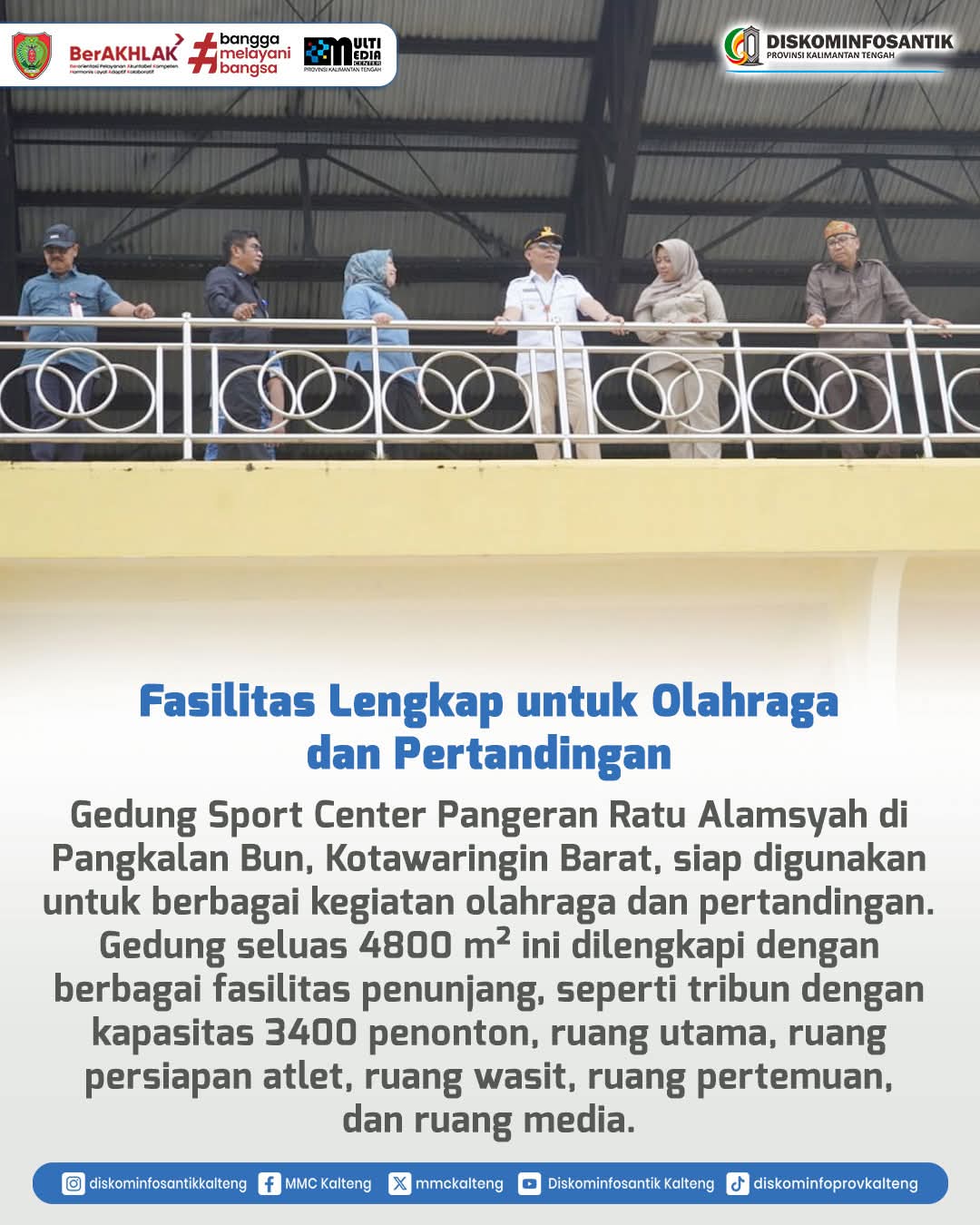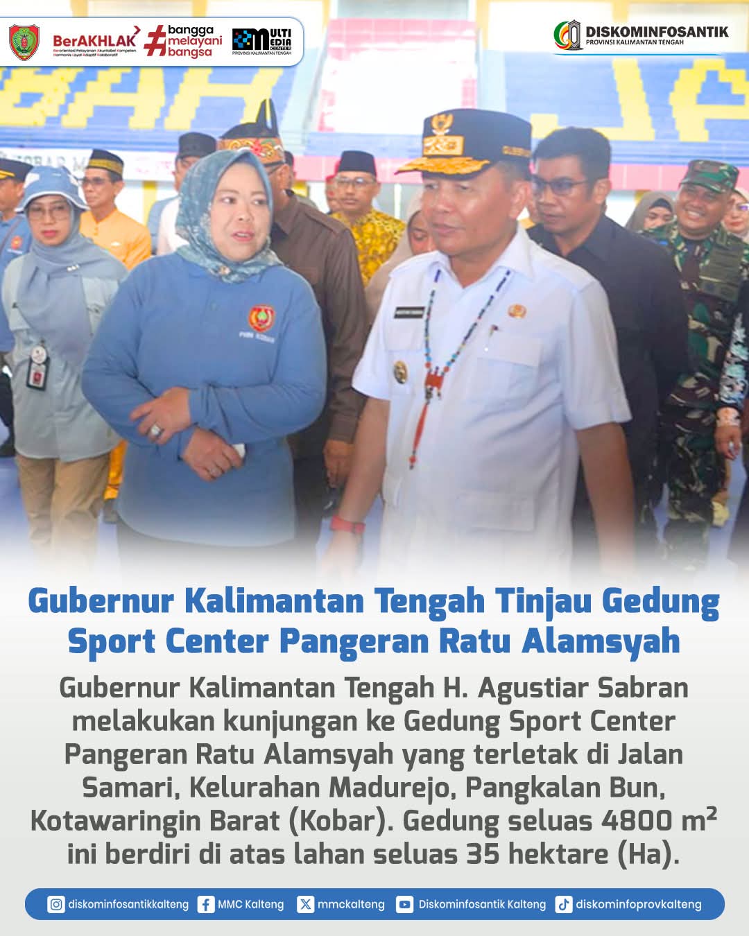 Gubernur Kalimantan Tengah H. Agustiar Sabran, melakukan peninjauan Gedung Sport Center Pangeran Ratu Alamsyah di Pangkalan Bun, Kotawaringin Barat, pada Kamis (5/6/2025). Gedung seluas 4800 m² ini telah diresmikan pada 10 Mei 2025 dan sudah siap digunakan untuk latihan dan pertandingan olahraga. Gubernur juga meninjau Stadion Sepak Bola Sampuraga Baru yang terletak bersebelahan, serta menekankan pentingnya persiapan matang untuk menyambut Pekan Olahraga Provinsi (Porprov) 2026.