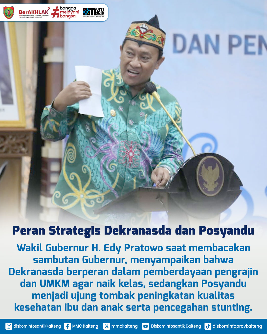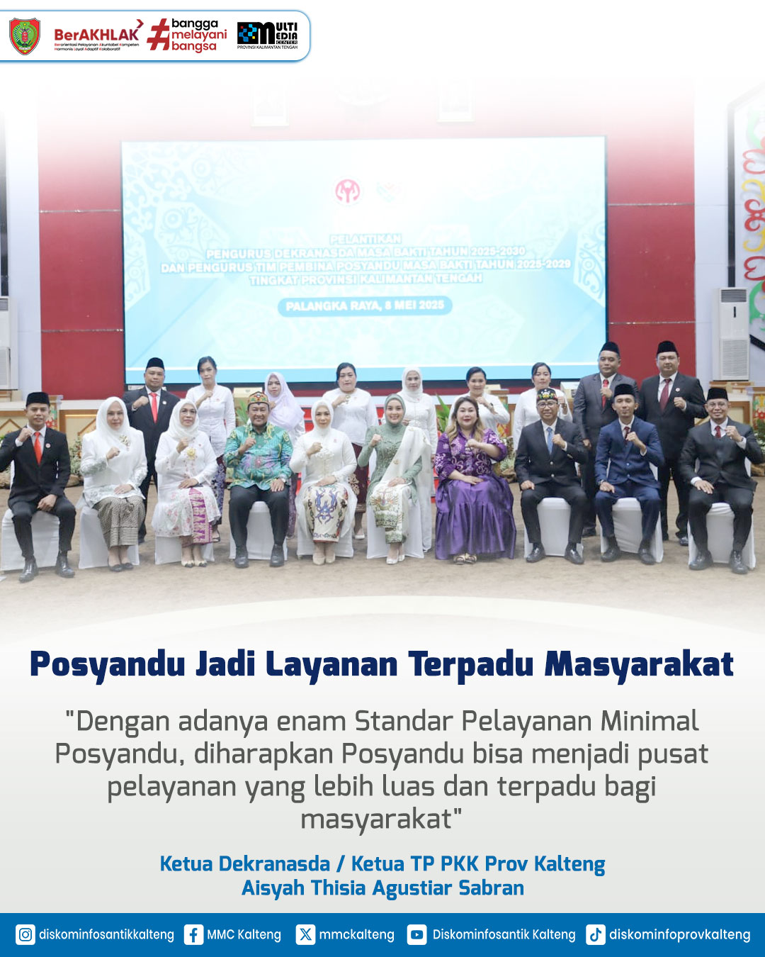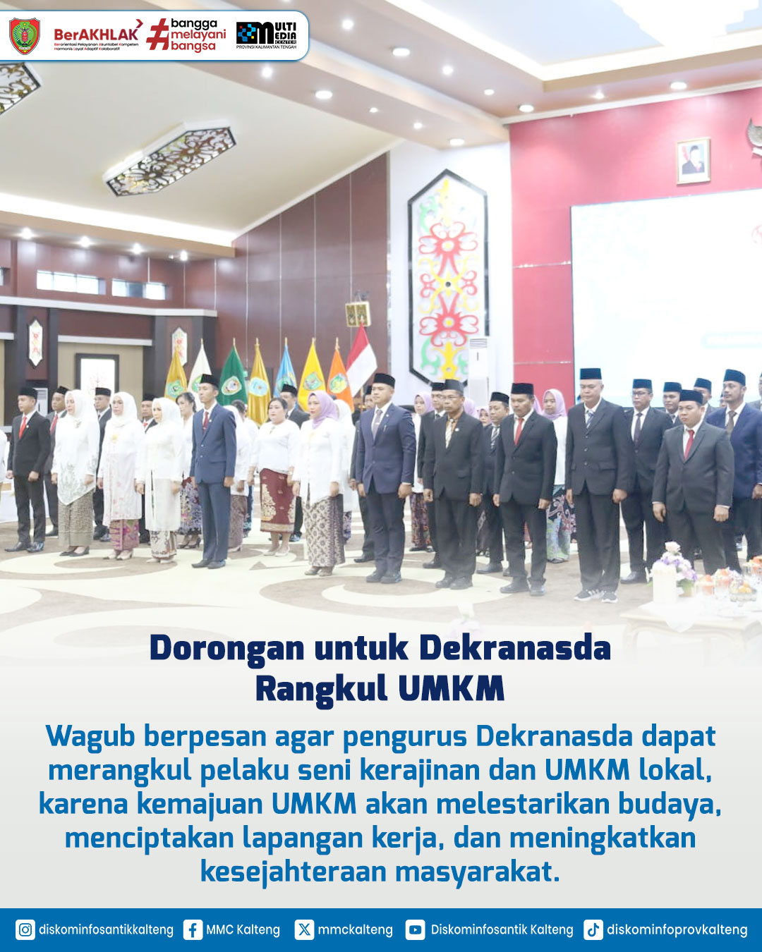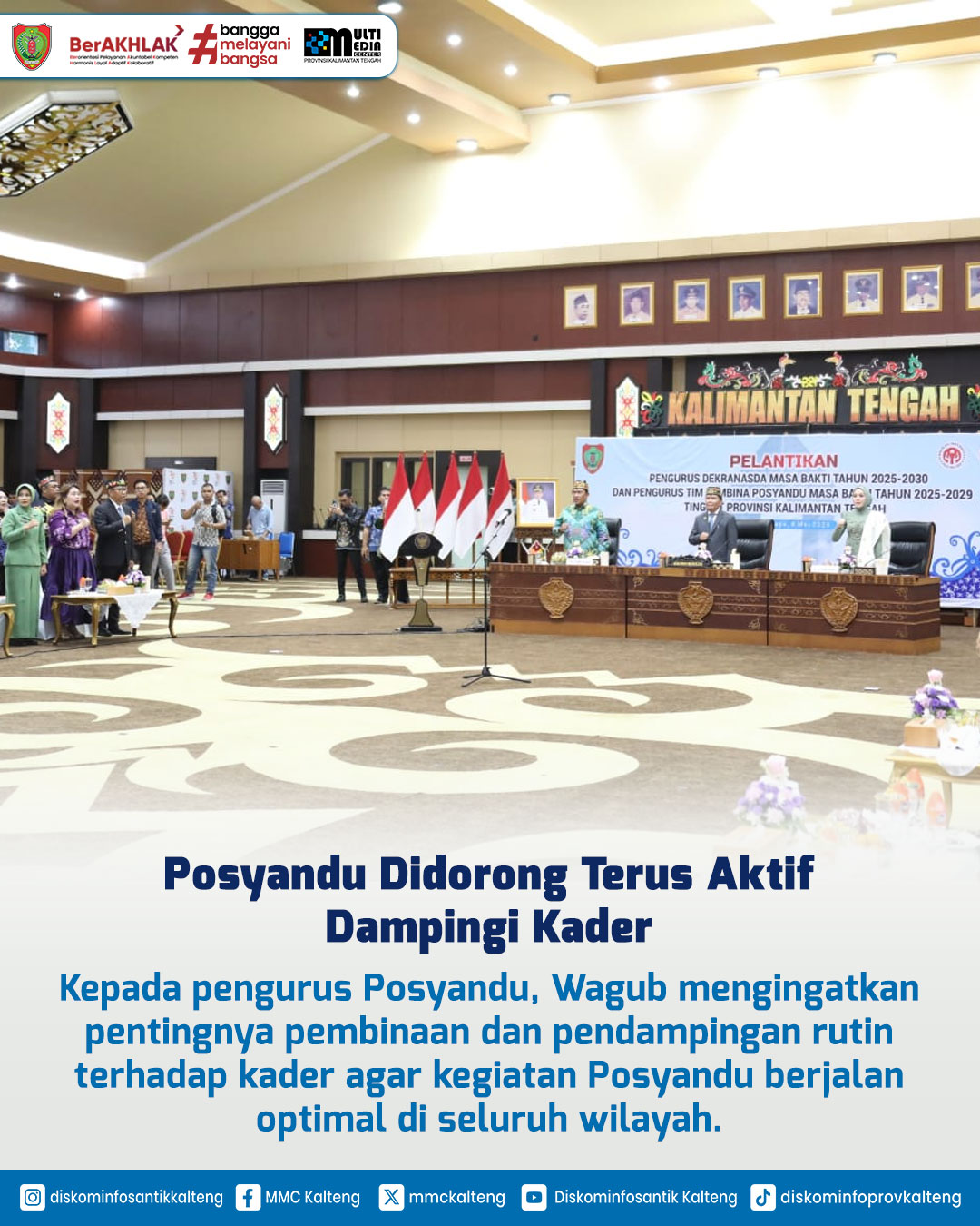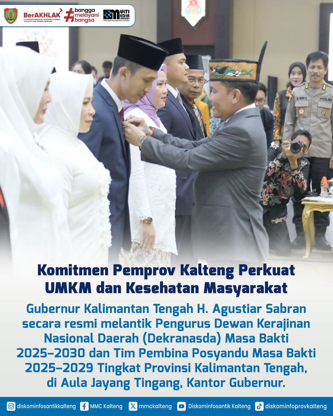 Dalam rangka memperkuat peran strategis Dekranasda dan Posyandu dalam pembangunan daerah, Gubernur Kalteng H. Agustiar Sabran melantik Pengurus Dekranasda Masa Bakti 2025–2030 dan Tim Pembina Posyandu 2025–2029 di Aula Jayang Tingang, Kantor Gubernur Kalteng, Kamis (8/5/2025). Wakil Gubernur H. Edy Pratowo menekankan pentingnya kolaborasi untuk mendukung pengrajin, UMKM, serta meningkatkan kesehatan ibu dan anak sebagai upaya pencegahan stunting. Ketua Dekranasda Aisyah Thisia Agustiar Sabran turut menegaskan peran Dekranasda sebagai wadah pembinaan dan promosi produk lokal berbasis budaya dan sumber daya alam.
