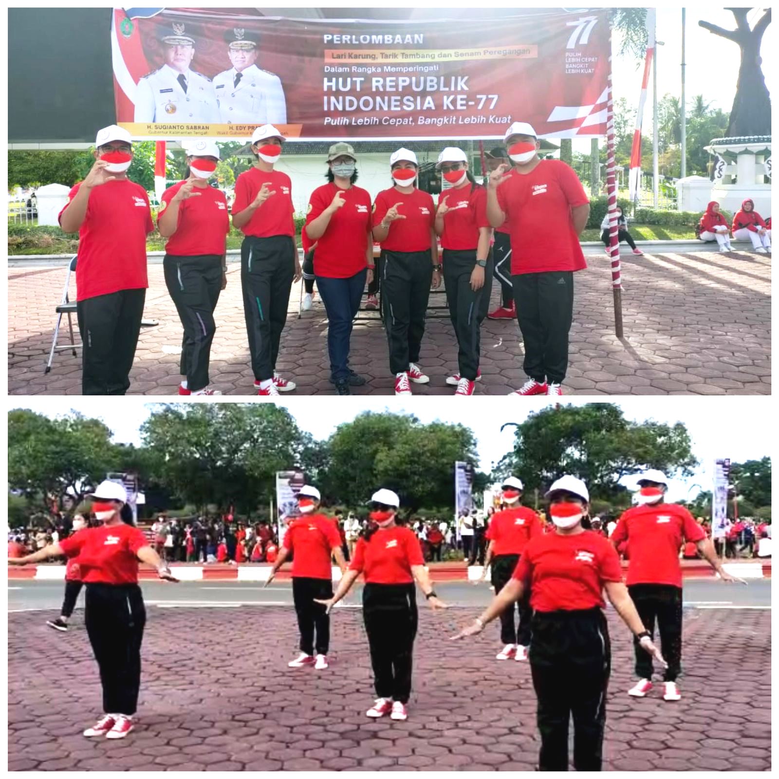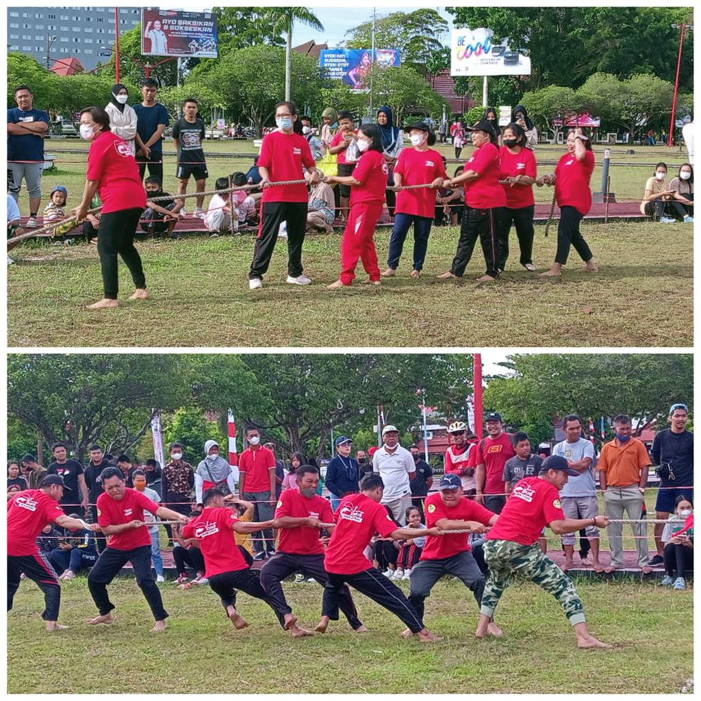 MMC Kalteng – Palangka Raya – Dalam rangka memeriahkan Hari Ulang Tahun (HUT) Republik Indonesia ke-77 tahun, Dinas Kelautan dan Perikanan (Dislutkan) Prov. Kalteng mengikuti perlombaan olahraga yang diselenggarakan oleh Pemprov. Kalteng. Perlombaan ini dipusatkan di Bundaran Besar Kota Palangka Raya, Minggu (14/8/2022). Jenis olahraga yang dilombakan adalah Senam Peregangan, Tarik Tambang, dan Lari Karung.