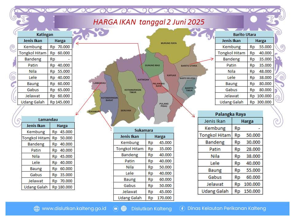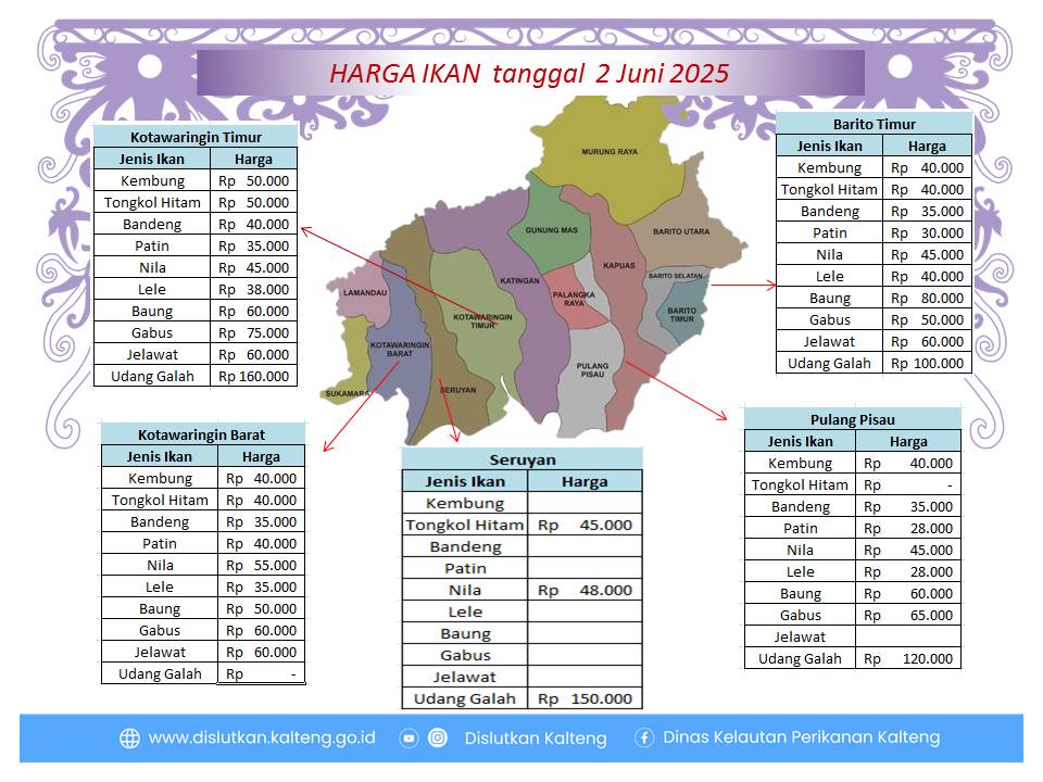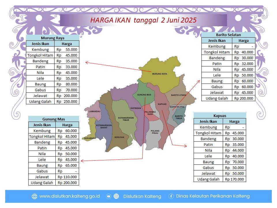 Info harga ikan pada tanggal 2 Juni 2025 dengan perubahan harga ikan terjadi di Kabupaten Barito Utara, Sukamara, Kotawaringin Barat, Barito Timur, Katingan dan Kotawaringin Timur.