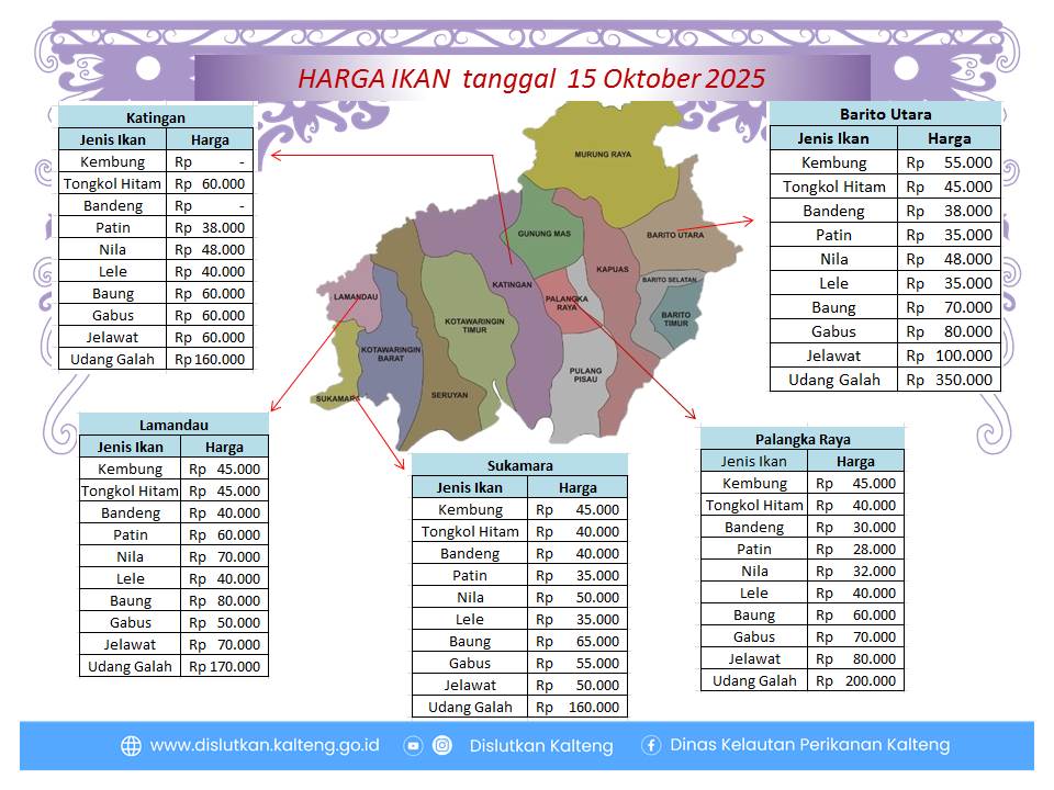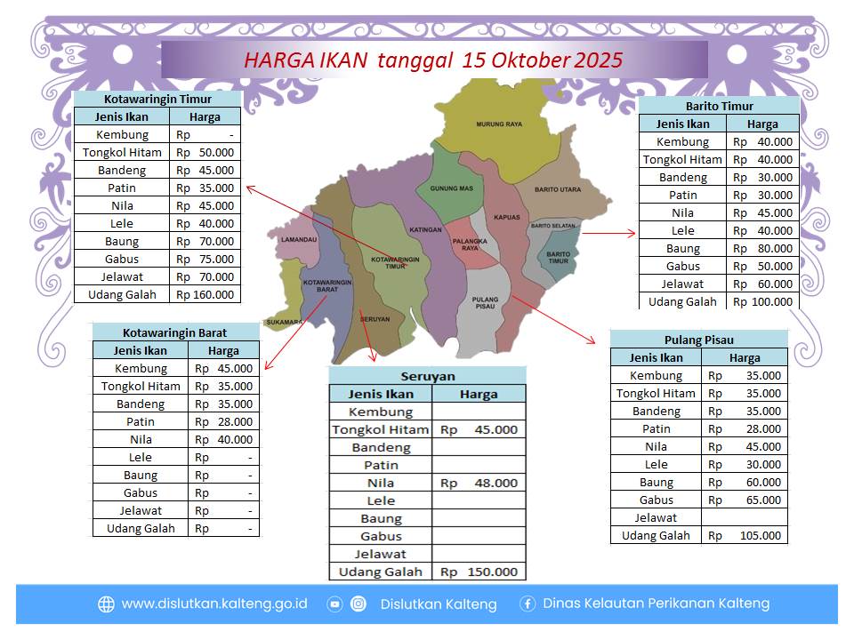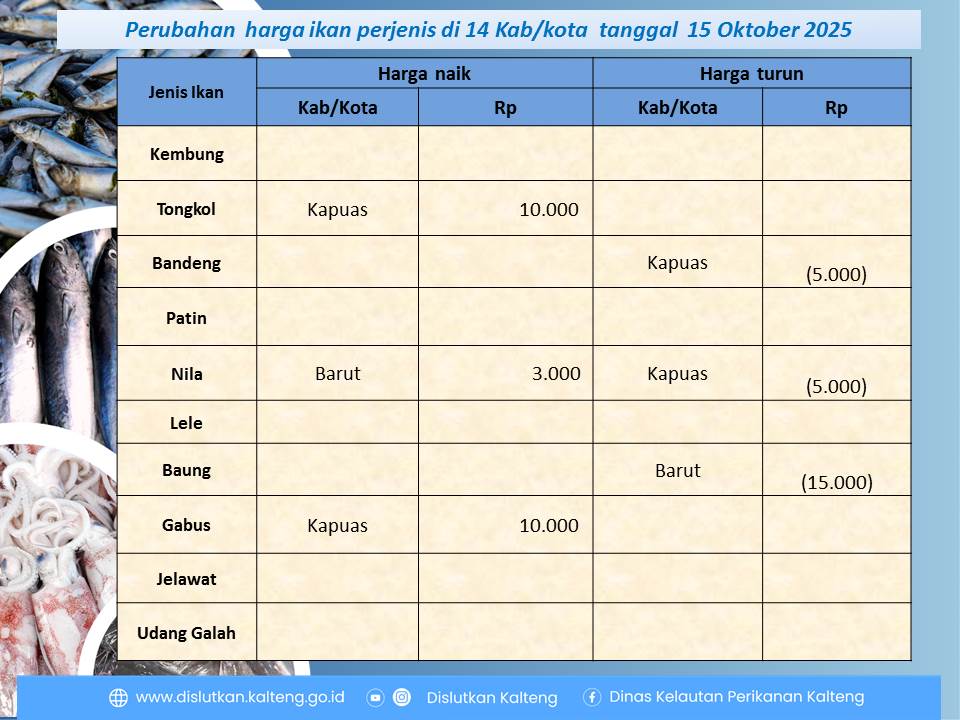 Info harga ikan tanggal 15 Oktober 2025 dengan perubahan harga ikan di Kabupaten Barito Utara dan Kapuas.