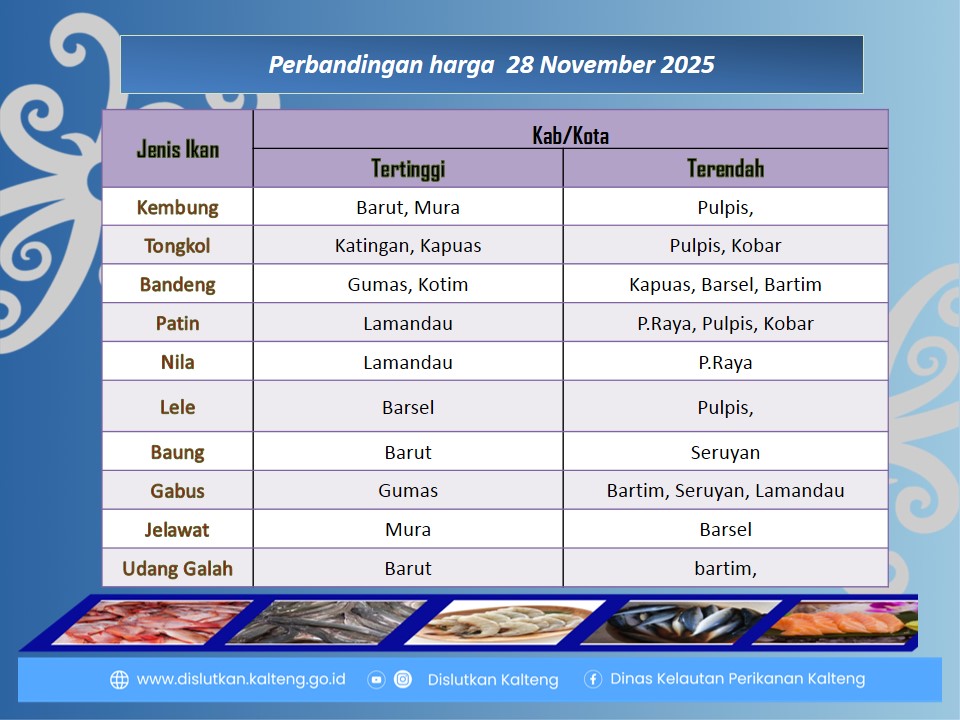 Info harga ikan tanggal 28 November 2025 dengan perubahan harga ikan di Kabupaten Barito Utara.