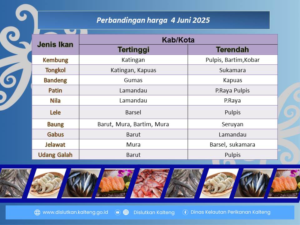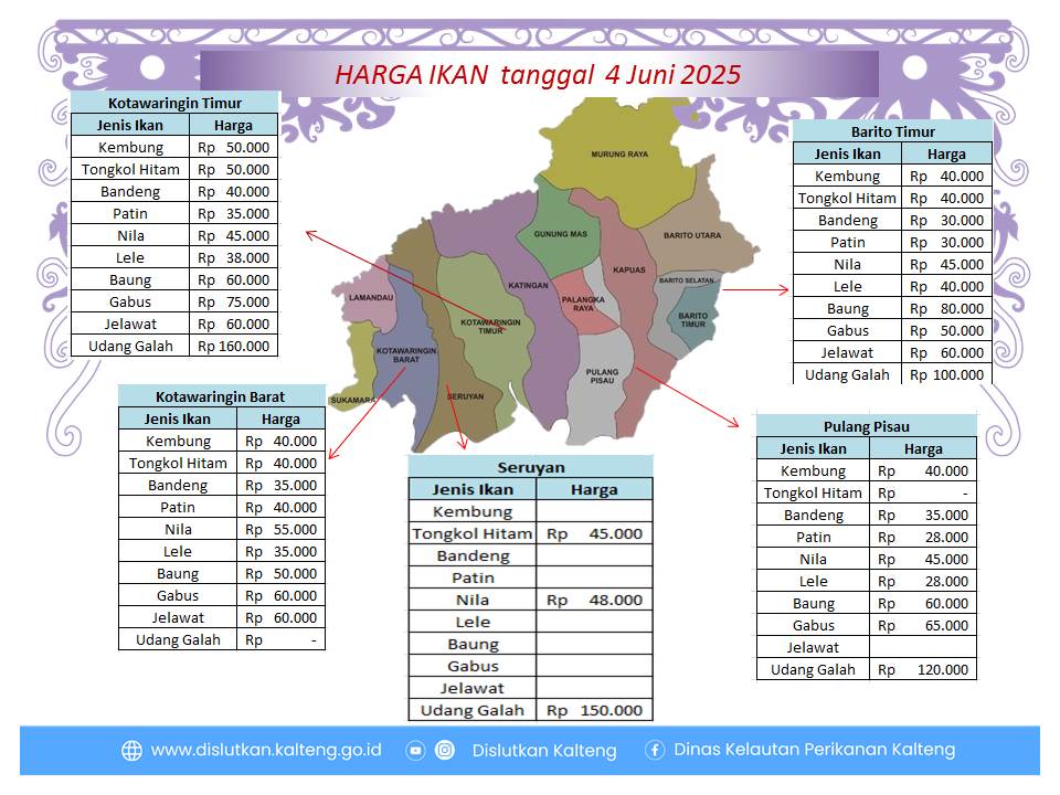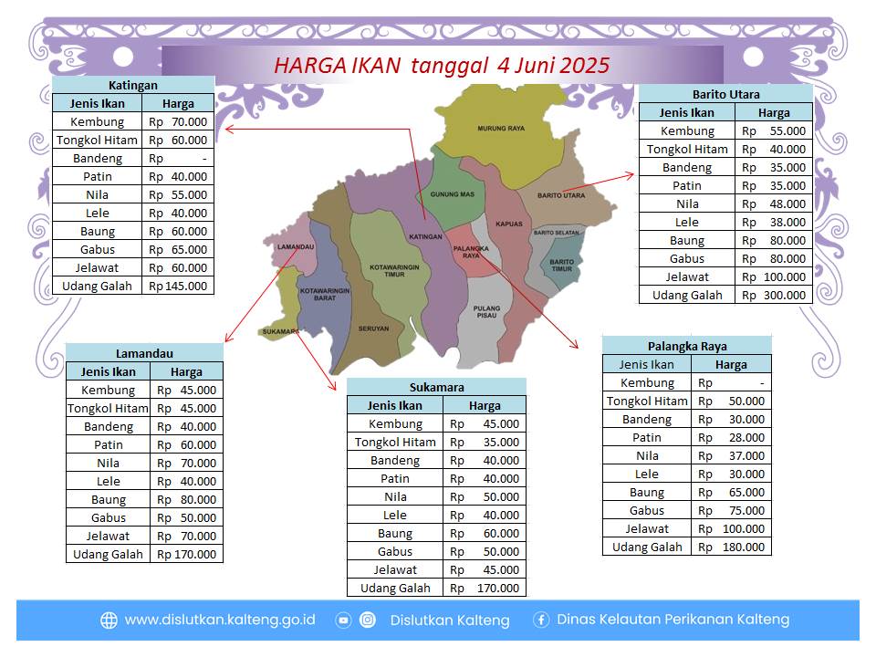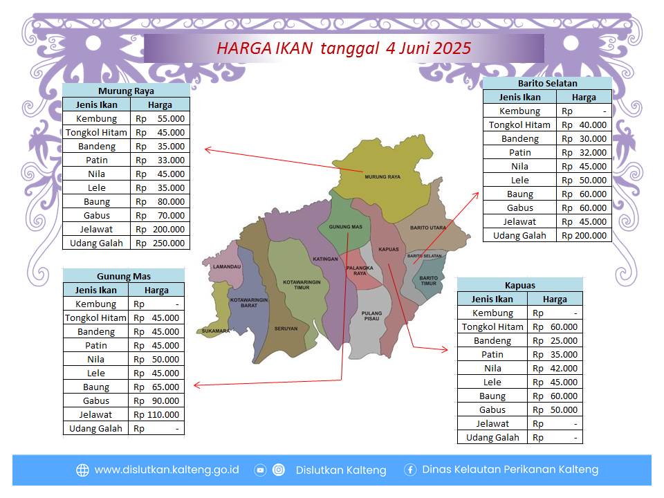 Info harga ikan tanggal 4 Juni 2025 dengan perubahan harga ikan terjadi di Kabupaten Lamandau, Barito Timur, Kapuas, Gunung Mas dan Kota Palangka Raya.