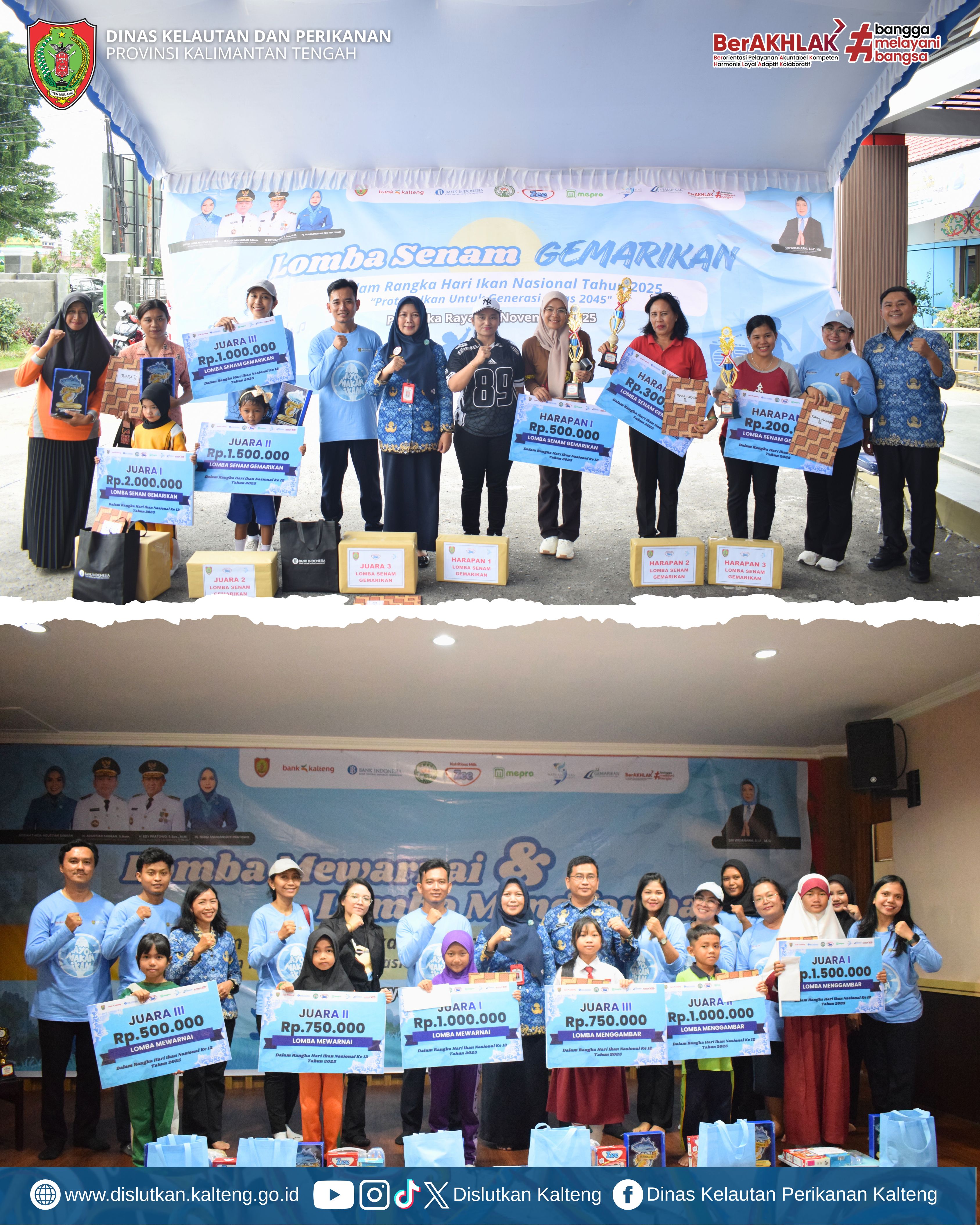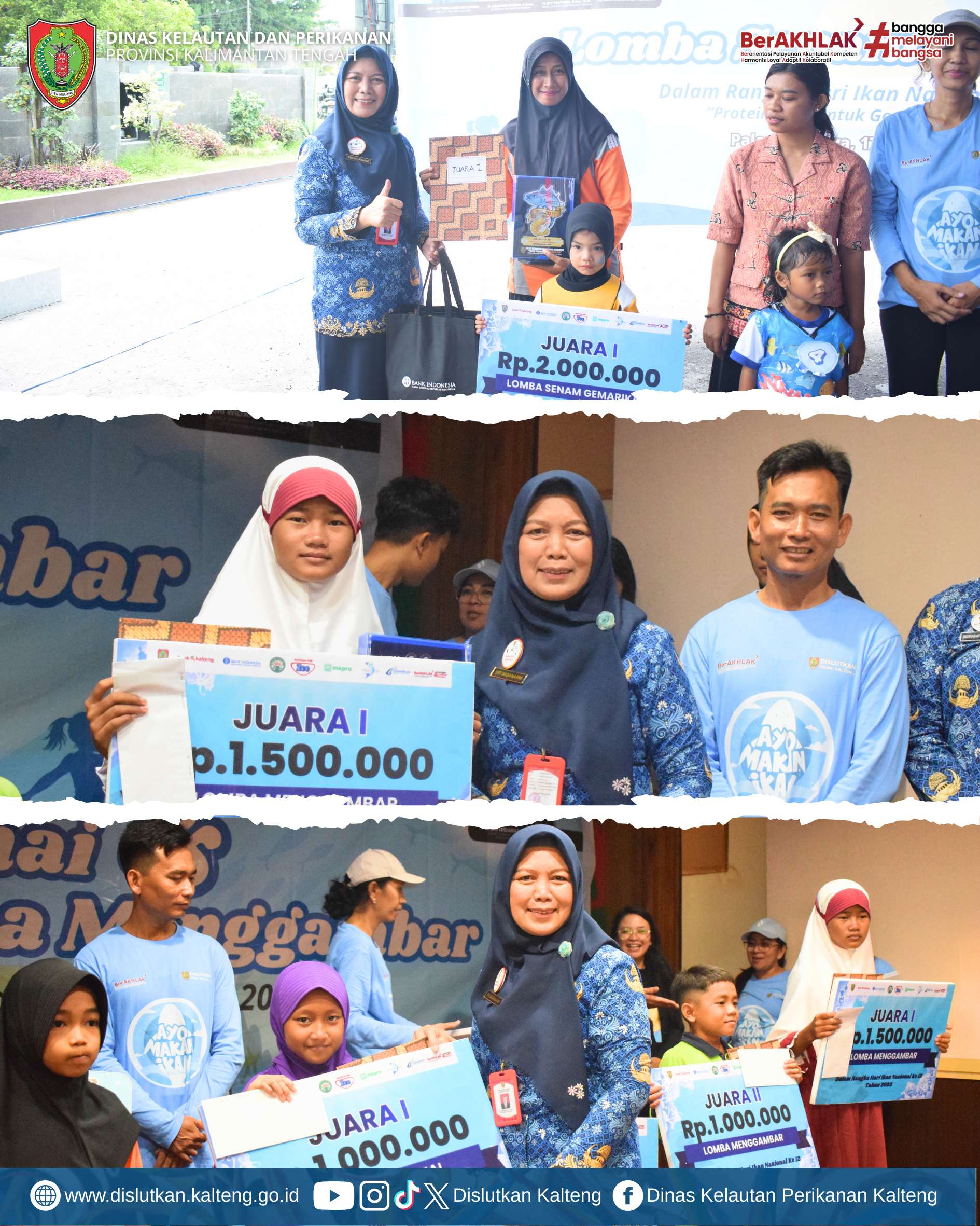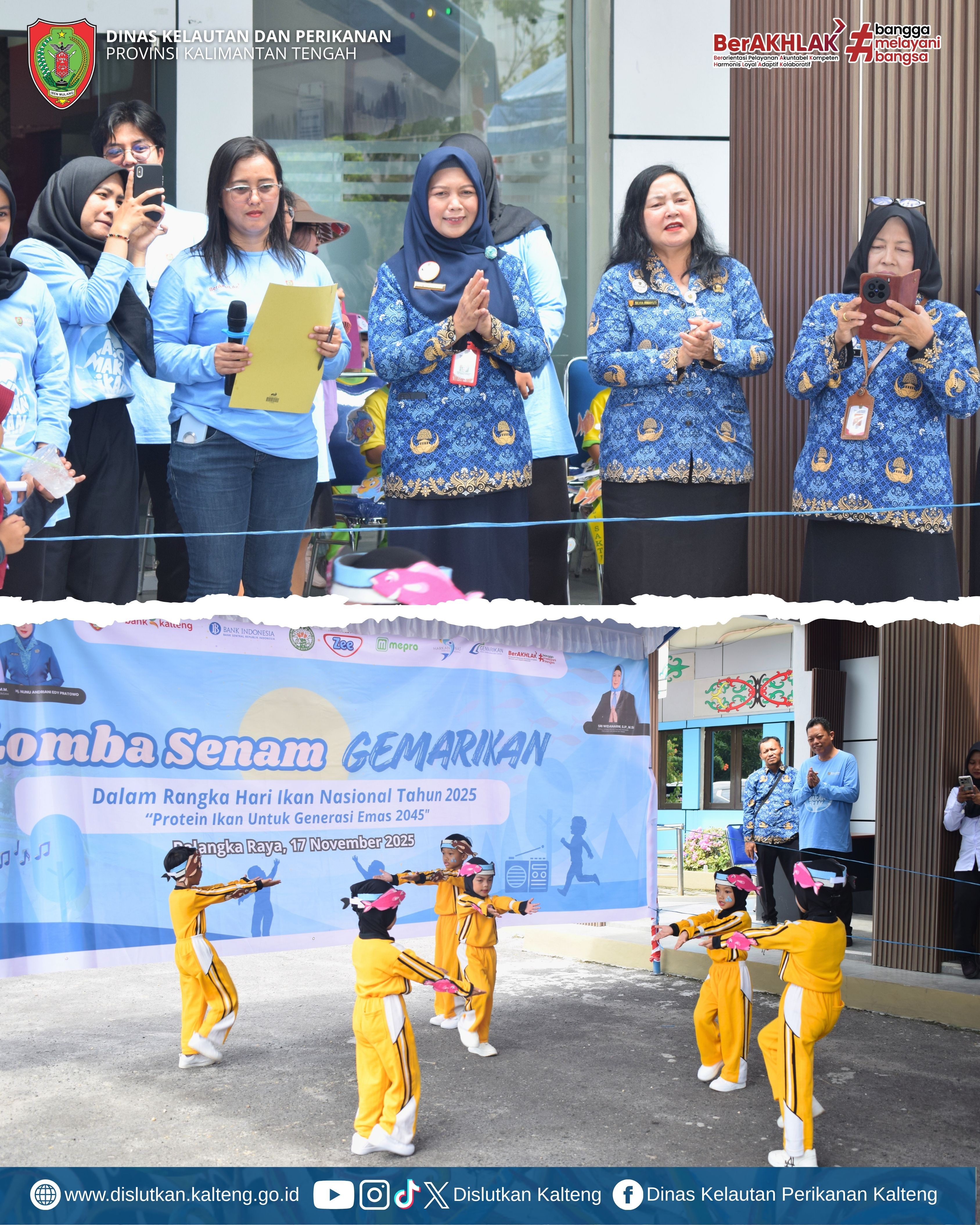 Kepala Dislutkan Prov. Kalteng Sri Widanarni, S.I.P, M.Si Melaksanakan Lomba Mewarnai dan Menggambar, Lomba Senam Gemar Makan Ikan Memperingati Hari Ikan Nasional Tahun 2025 bertempat di Kantor Dislutkan, Senin (17/11/2025).