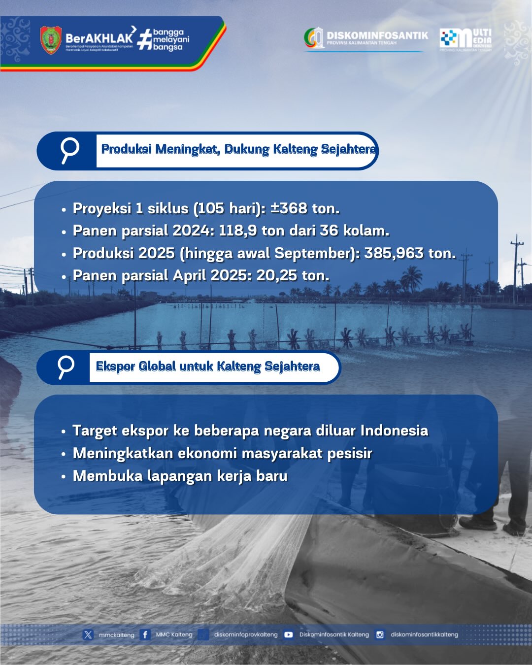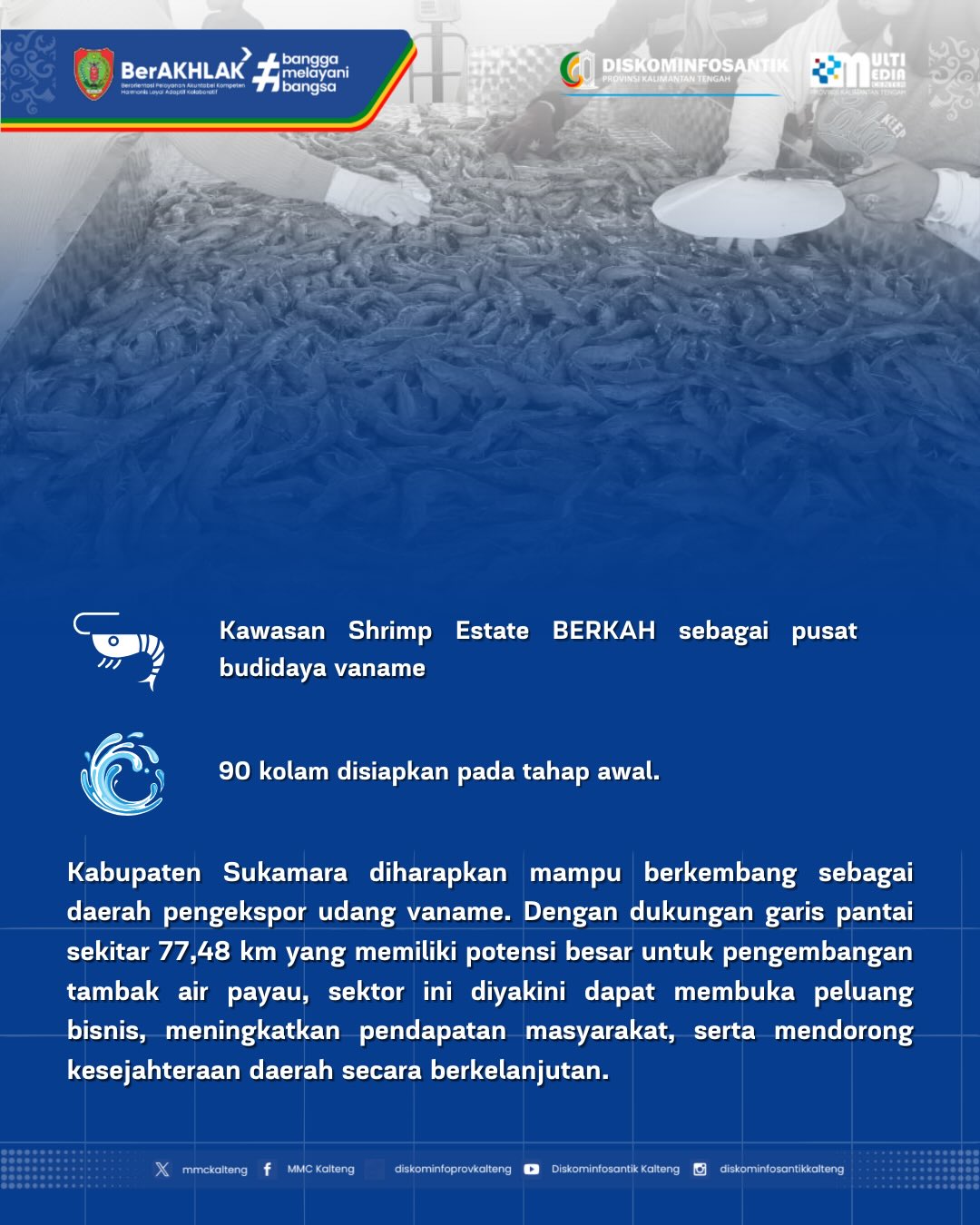 Pemerintah Provinsi Kalimantan Tengah terus mengembangkan sektor perikanan, khususnya budidaya udang vaname di Sukamara yang memiliki potensi besar berkat garis pantai yang luas dan keberadaan kawasan Shrimp Estate BERKAH sebagai sentra budidaya.