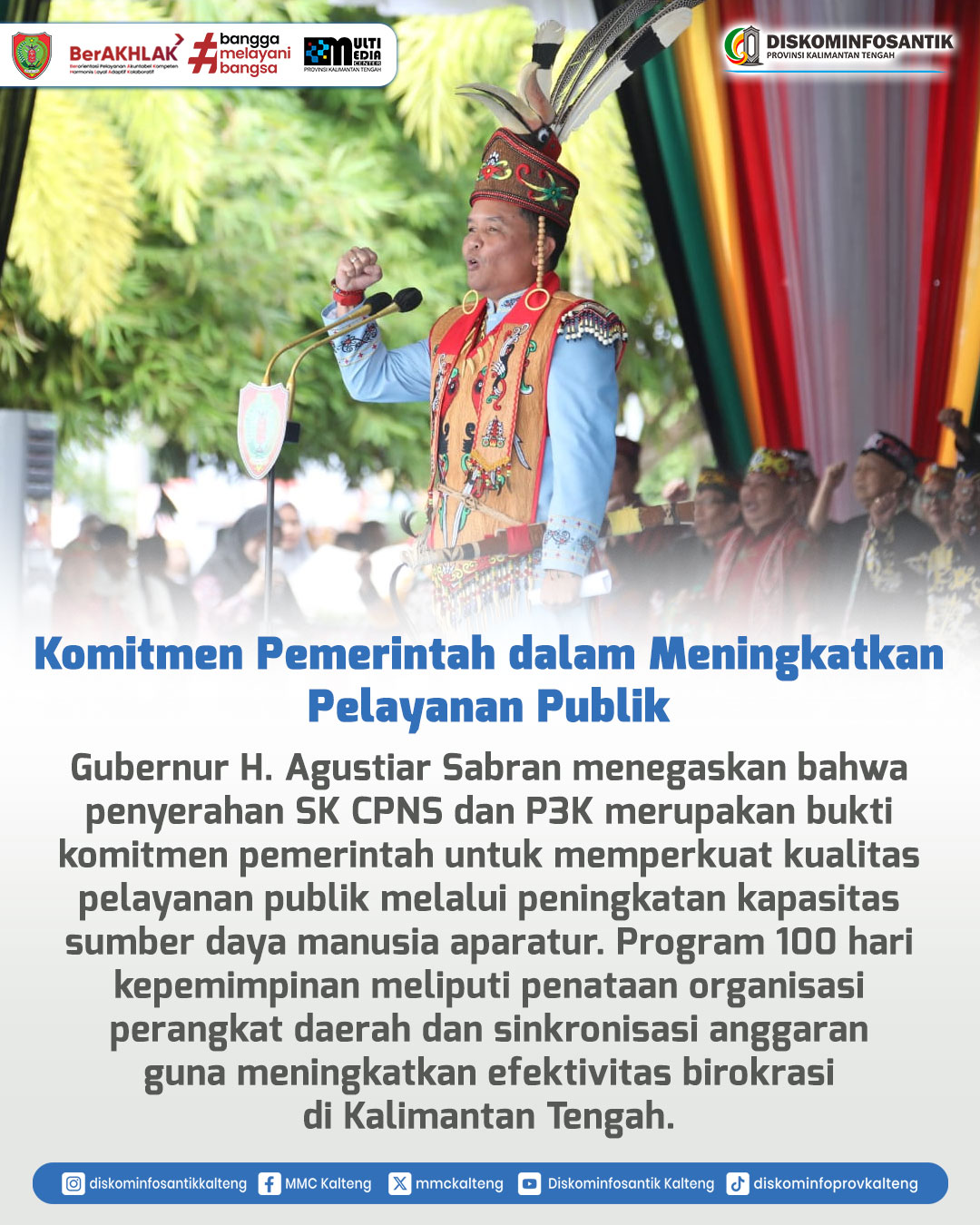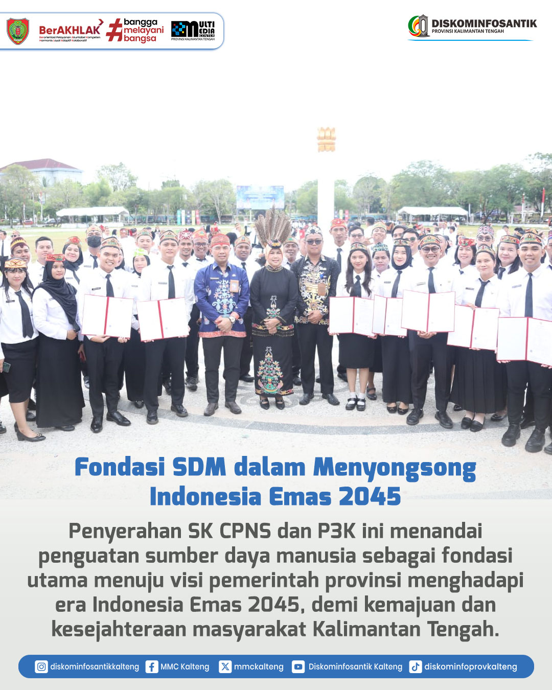 Peringatan Hari Jadi ke-68 Provinsi Kalimantan Tengah yang digelar di Halaman Kantor Gubernur pada Jumat (23/5/2025), ditandai dengan penyerahan Surat Keputusan (SK) bagi CPNS dan P3K secara simbolis sebagai bagian dari program 100 hari kepemimpinan Gubernur H. Agustiar Sabran dan Wakil Gubernur H. Edy Pratowo. Penyerahan ini bertujuan memperkuat sumber daya manusia aparatur demi peningkatan kualitas pelayanan publik dan percepatan pembangunan Kalimantan Tengah yang merata dan berkeadilan. Para CPNS dan P3K diharapkan menjalankan amanah dengan penuh tanggung jawab untuk mewujudkan visi “Kalteng Berkah, Kalteng Maju, dan Kalteng Bermartabat” menuju Indonesia Emas 2045.