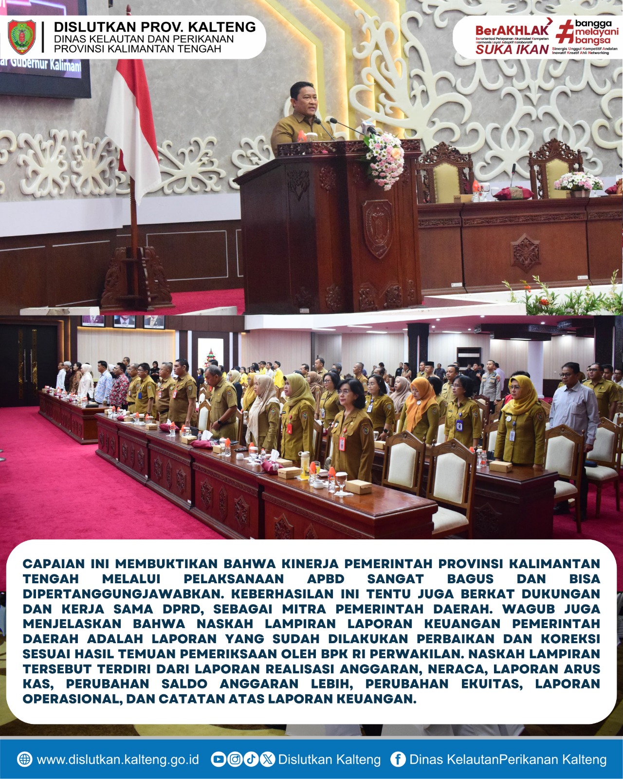 Dalam pidato tertulis Gubernur yang dibacakan oleh Wakil Gubernur, disampaikan rasa syukur atas capaian Wajar Tanpa Pengecualian (WTP) dari Badan Pemeriksa Keuangan Republik Indonesia (BPK RI) Perwakilan Kalimantan Tengah atas Laporan Keuangan Pemerintah Daerah (LKPD) Tahun 2024. Prestasi ini merupakan keberhasilan ke-11 kali berturut-turut sejak tahun 2014 yang menunjukkan tata kelola keuangan daerah yang akuntabel dan transparan. Capaian ini membuktikan bahwa kinerja Pemerintah Provinsi Kalimantan Tengah melalui pelaksanaan APBD sangat bagus dan bisa dipertanggungjawabkan. Keberhasilan ini tentu juga berkat dukungan dan kerjasama DPRD, sebagai mitra Pemerintah Daerah. Wagub juga menjelaskan bahwa naskah lampiran laporan keuangan pemerintah daerah adalah laporan yang sudah dilakukan perbaikan dan koreksi sesuai hasil temuan pemeriksaan oleh BPK RI perwakilan. Naskah Lampiran tersebut terdiri dari laporan realisasi anggaran, neraca, laporan arus kas, perubahan saldo anggaran lebih , perubahan ekuitas, laporan operasional dan catatan atas laporan keuangan